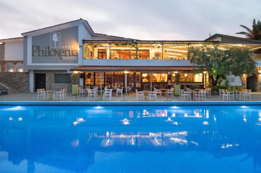 Готель Philoxenia розташований у сосновому лісі, за 300 метрів від піщаного пляжу Псакудія на півострові Халкідіки. До послуг гостей басейн і безкоштовний Wi-Fi біля басейну. Для гостей сервірують ситний сніданок "шведський стіл". У ресторані подають страви середземноморської кухні, приготовані з місцевих продуктів.